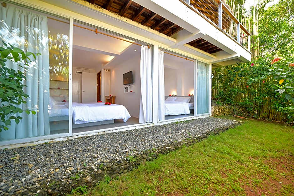 This two-story villa features 2 air-conditioned bedrooms upstairs and a kitchen, large living room and veranda with a view downstairs. Mosquito nets are included.